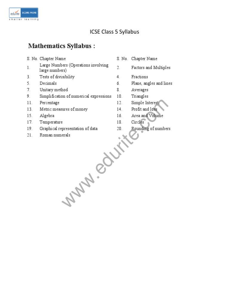 Additionally the board maintains a healthy learning environment in its affiliated schools and hence students who are studying under this board get sufficient support to develop their skills and knowledgeICSE Class 5 Maths Syllabus is the most efficient study material for students studying in ICSE board class 5. Kickstart your exam preparation by going through ICSE Maths Syllabus for Class 10 and know the important topics that need to be focused more.